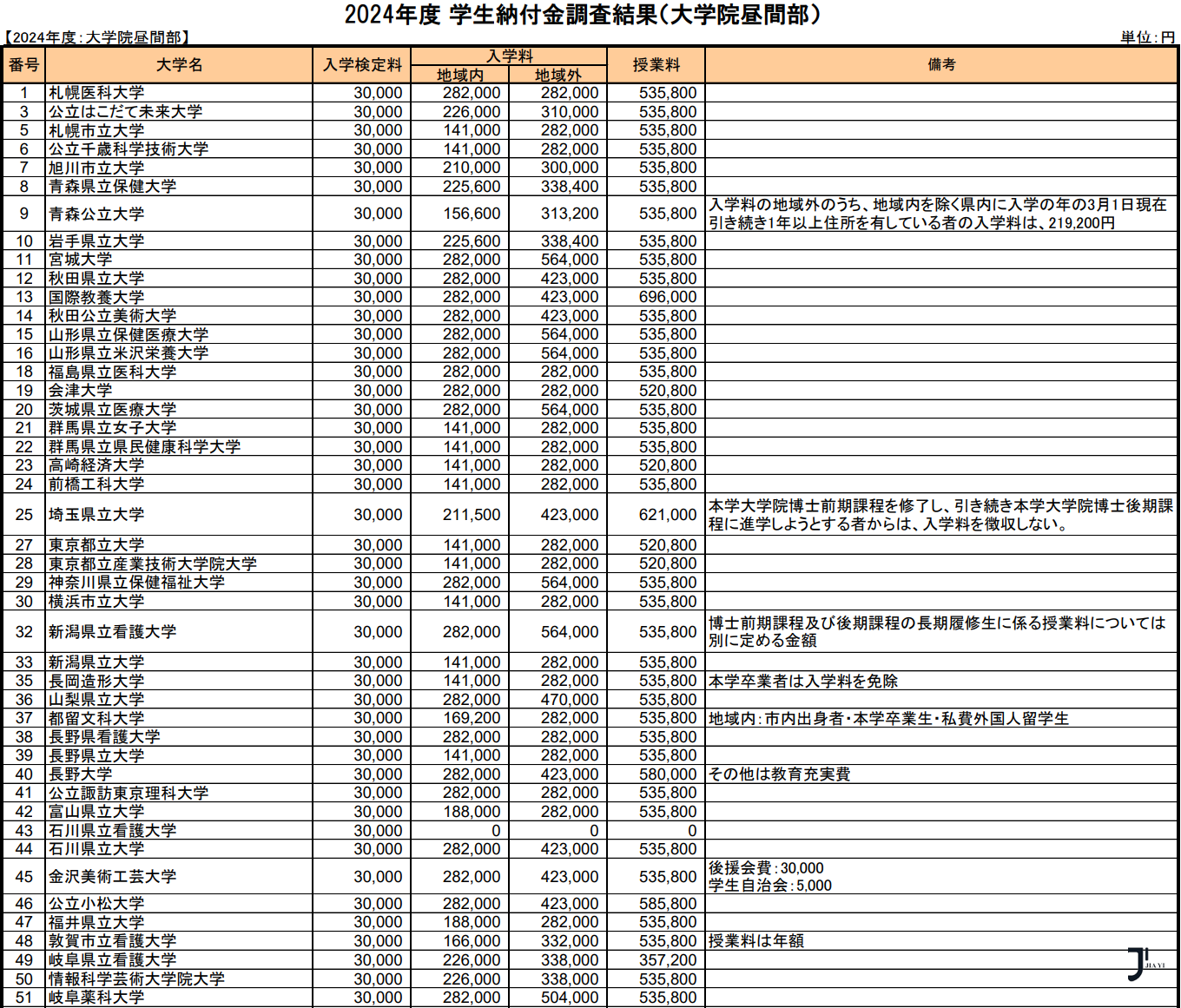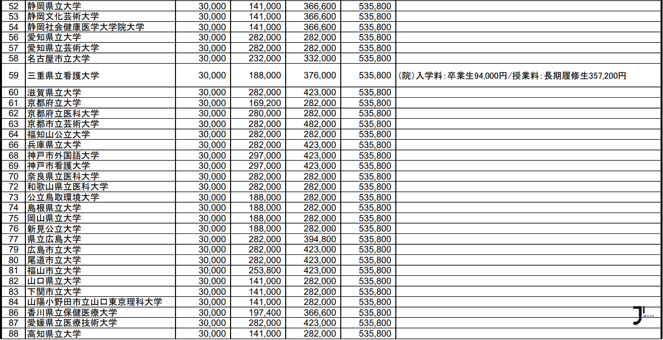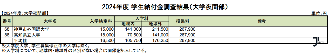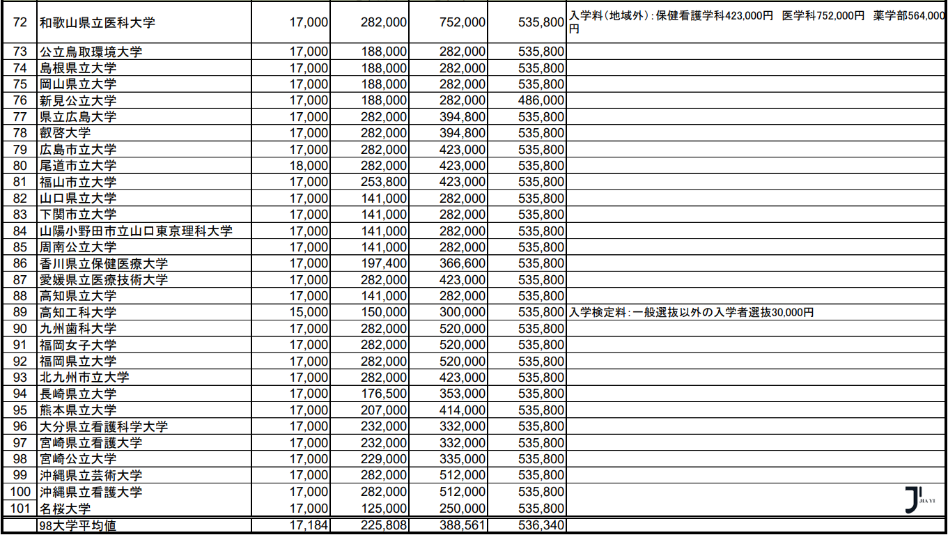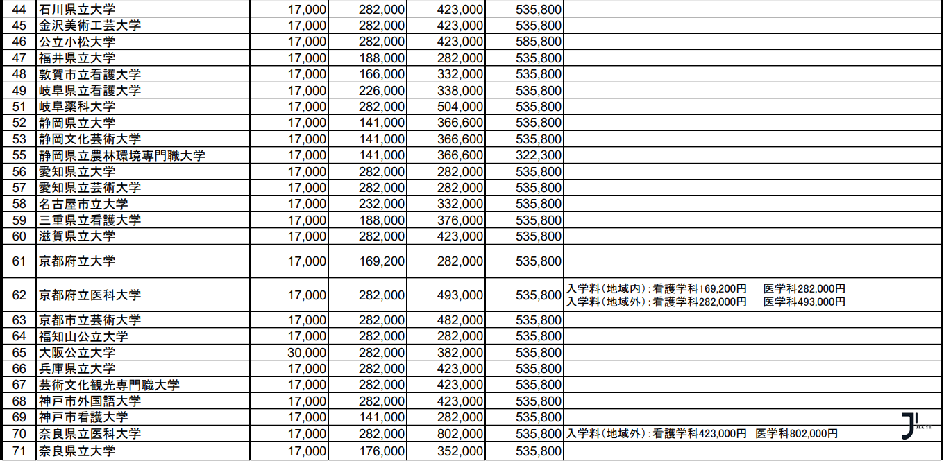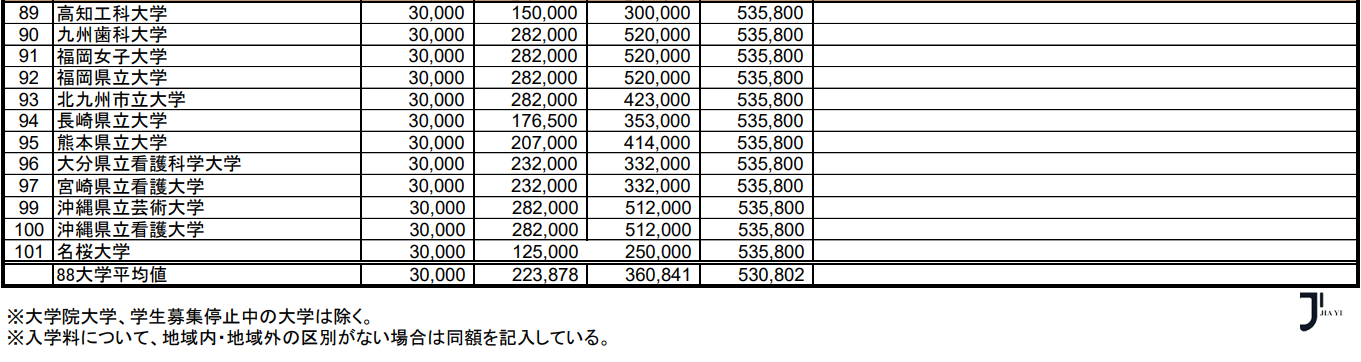 文部科学省最新统计,日本公立大学学部·大学院2024年度纳付金调查结果如下: