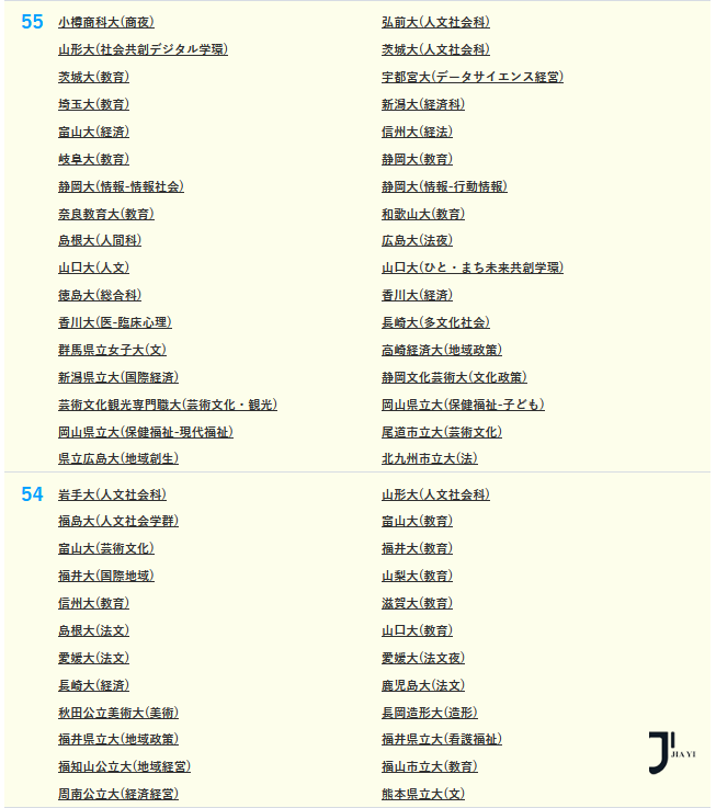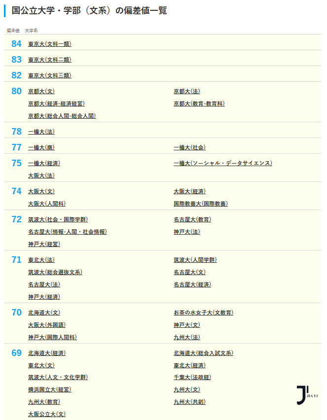 东京大学和京都大学仍旧统领文科,一桥大学和大阪大学的文科、商科、法学专业实力不容小觑。筑波大学、神户大学的某些专业甚至超越帝大。
