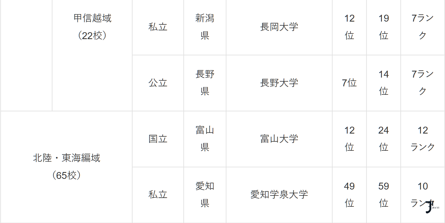 北陸・東海編(65校中の順位)