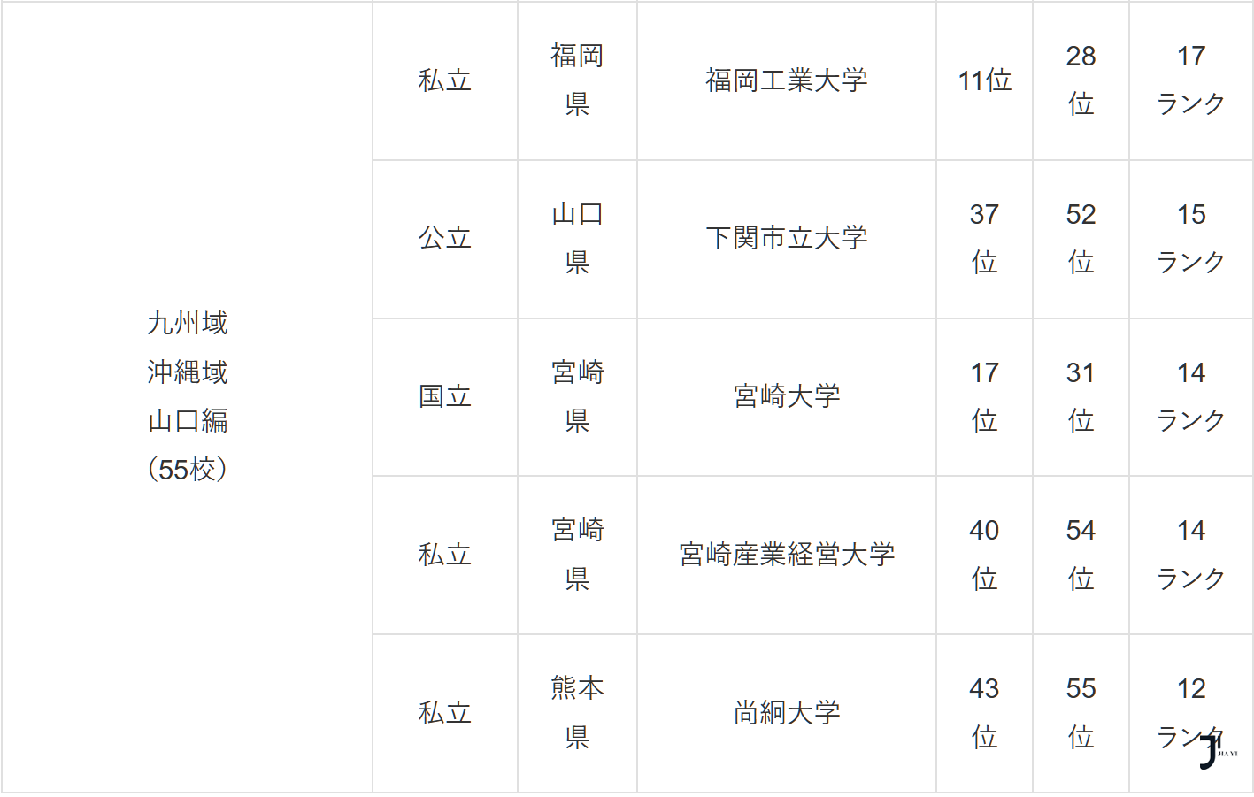 九州・沖縄・山口編(55校中の順位)